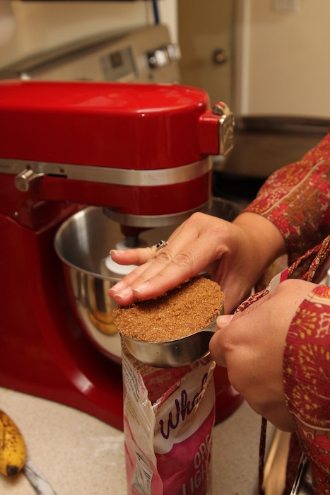 Place the remaining bananas into your mixer adding white and brown sugar to the bowl and beat on a medium speed until the banana sugar mixture becomes a cream.
