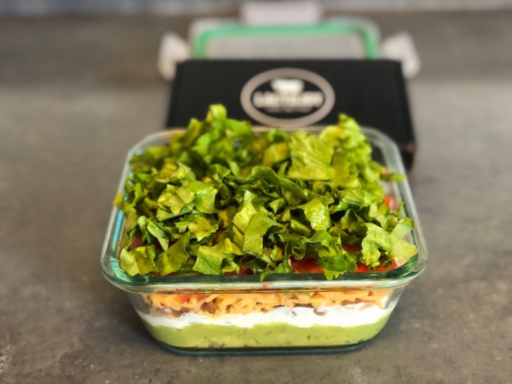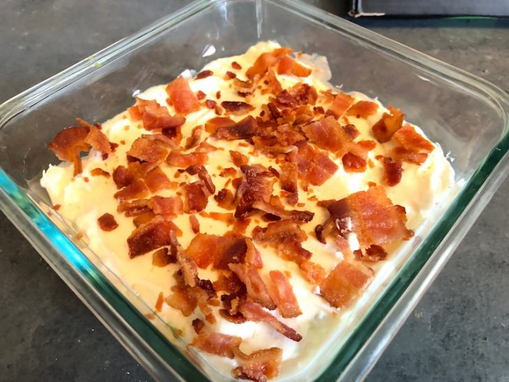 • In a 1-1 1/2 quart glass dish layer in the following order: guacamole, yogurt/cream cheese mixture, bacon, cheese, tomato, lettuce. As you add each layer be sure to spread it evenly across the dish. Serve with crackers, tortilla chips or baguette chunks.