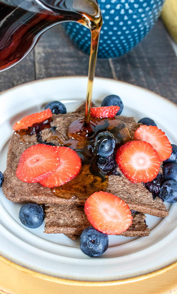 Remove from oven and cool for 10-15 minutes before slicing. Serve immediately with additional maple syrup, the remaining blueberries, and fresh, sliced strawberries, if desired. Enjoy!