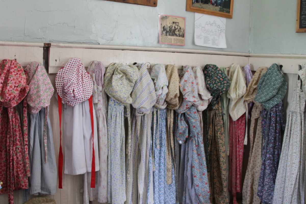 The covered wagon takes us to the schoolhouse where we ring the bell and learn about education on the prairie.